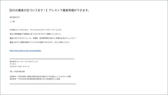 Pマーク、 ISOコンサルにおける支援実績 No.1(注1)のISO/Pマークの取得・運用支援サービス「認証パートナー」を提供する株式会社スリーエーコンサルティング(本社:大阪府大阪市、代表取締役社長:竹嶋 寛人)は、このたび、当社が提供するクラウド型ISO管理ツール『ISMSアシスト』『9001アシスト』『14001アシスト』において、「審査前連絡」機能の拡充およびアップデートを実施いたしました。今回のアップデートにより、審査の1週間前および前日に自動で通知が届くようになり、審査日をうっかり失念することなく、確実に準備を進めていただける環境を整えました。