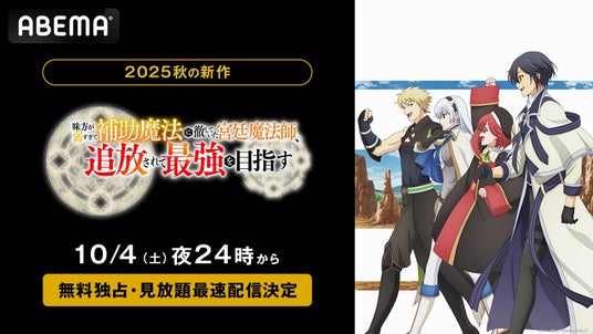 新しい未来のテレビ「ABEMA」は、新作秋アニメ『味方が弱すぎて補助魔法に徹していた宮廷魔法師、追放されて最強を目指す』を、2025年10月4日(土)から毎週土曜夜24時より無料独占・見放題最速配信いたします。