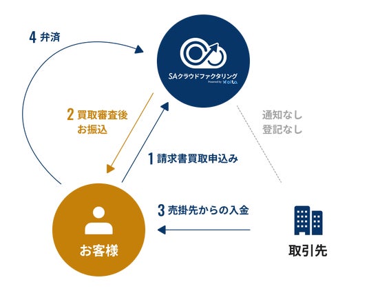 従来の銀行融資と異なり、借入ではなく売掛金の売却によって資金調達を行うため、審査に信用情報の照会や記録が残らず、担保や保証人も不要です。