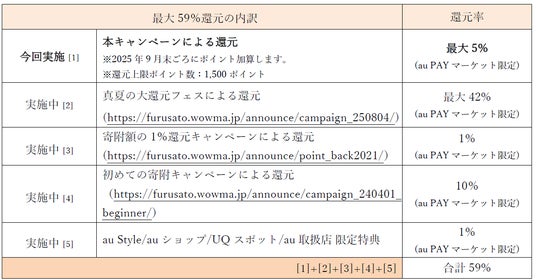 さらに、8月4日から開催中の「真夏の大還元フェス」の特典や実施中のキャンペーンとあわせると、合計最大59%のポイント還元となるチャンスがあります。真夏の大還元フェスについてはこちら(https://furusato.wowma.jp/announce/campaign_250804/)をご確認ください。