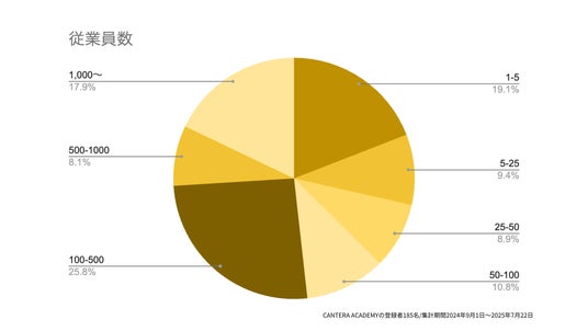「CANTERA ACADEMY」に登録いただいた方が所属する企業の従業員規模も多様であり、特に、「100名以上500名未満」の企業に所属している登録者が最も多く、全体の25%を占めています。
