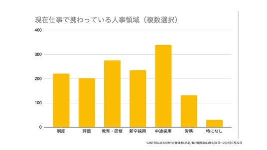 「CANTERA ACADEMY」に登録された人事担当者を対象にしたアンケートの結果、現在携わっている人事領域において「中途採用」と「教育・研修」が最も多いものの、その他の領域でも幅広い人事領域に携わっていることが、今回のアンケートから明らかになりました。CANTERA ACADEMYは、こうした多様なニーズに応えるため、幅広いコンテンツをご用意し、多くの人事担当者をサポートしています。