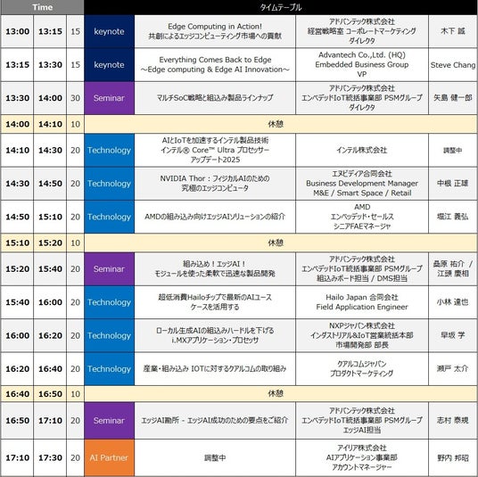 当日は、インテル、AMD、NVIDIA、NXP、Qualcomm、Hailo(五十音順)、業界を牽引する半導体企業による最新のテクノロジー講演に加え、パートナー企業によるAIアプリケーション開発事例の紹介を予定しております。さらに、大阪会場ではアドバンテック初の試みとして、AIプログラミングのワークショップも開催いたします。