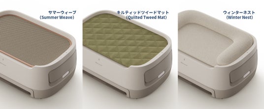さらに、ペットがリラックスして休めるよう、静かさ*³にもこだわり、ペットが乗っている間は超静音運転を実施します。ペットの気分や季節に合わせ、ベッドの素材は3種類から選択可能です。通気性のある天然サイザル素材を使用し、爪とぎにも使える「サマーウィーブ」(同梱)に加え、優しい肌触りの「キルティッドツイードマット」(別売り)、寒い季節にぴったりのふんわりベッド「ウィンターネスト」(別売り)をご用意しています。