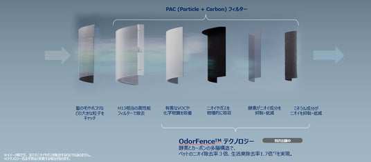 「OdorFence(TM) テクノロジー」は酵素とカーボンの多層構造で、オゾンを使用せずに、ニオイを除去するため、ペットやお子様のいる家庭でも安心してお使いいただけます。