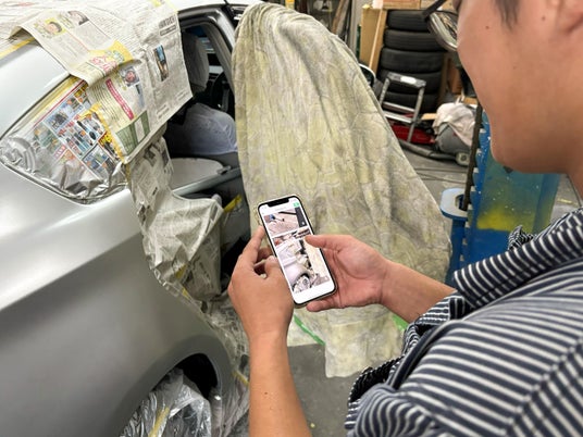 【課題】サクラ自動車は、事業の9割をタクシー車両が占める自動車整備工場です。タクシーは走行頻度が高く事故も多いため、日々多くの修理依頼が舞い込みます。特に事故修理では、保険会社への提出用に修理前後の写真撮影が必須ですが、従来はデジタルカメラで撮影し、事務所に戻ってパソコンへ取り込む運用を行っていました。しかし、タクシー車両は同じ車種・同じ色が多いため、写真がどの車両のものか判別しづらく、整理に多大な時間と手間がかかっていました。また、請求書を発行する経理側と現場の整備士との間で作業内容の共有が十分に行き届いておらず、細かな修理箇所が請求書に反映されない「請求漏れ」が発生することも課題でした。