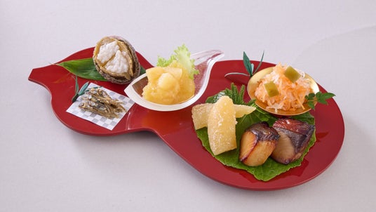 横山タカ子さん監修メニューりんごきんとん(煌・彩)、鮑やわらか煮塩麹(彩)、田作りごま和え(煌・彩)、紅白なます昆布のせ(七福神・さくら・福寿)、数の子粕漬(七福神・さくら・福寿)、鰤味噌焼(七福神・さくら・福寿)