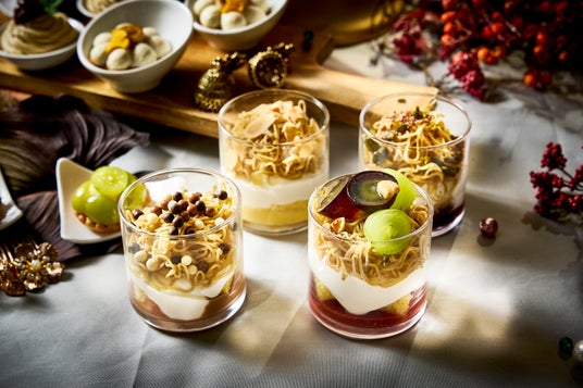 さらに、注目のライブデザートとして、お好みに合わせてオリジナルモンブランパフェを作ることができる「モンブランパフェステーション」が登場します。ホテル特製の上品な甘さのスポンジケーキに、ラムや洋梨など4種類のソースからお好みのものをセレクト頂き、その上から、濃厚な風味が楽しめる国産和栗のなめらかなクリームを、お客様の目の前で丁寧に絞り上げます。仕上げには、ピスタチオやヘーゼルナッツなど、マロンクリームの味わいを引き立てる8種類のトッピングをご用意。お好きな素材を自由に組み合わせて、世界にひとつだけの特別なモンブランパフェをお楽しみいただけます。