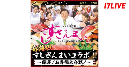 17LIVE株式会社(東京都渋谷区、代表取締役:ジャン・ホンフイ、URL:https://jp.17.live/)が運営する日本最大級のライブ配信アプリ「17LIVE(イチナナ)」は、株式会社喜代村(東京都中央区、代表: 木村 清)が国内に46店舗をチェーン展開する人気の寿司店「つきじ喜代村すしざんまい」と初のコラボレーションとなるアプリ内イベント、『奇跡の「すしざんまい」コラボ!!~開幕!お寿司大合戦!~』を、2025年8月22日(金)より開催することが決定しましたので、お知らせいたします。