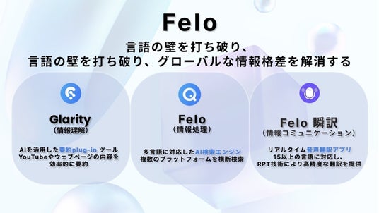 Feloは、Felo Searchに加え、リアルタイム翻訳ツール「Felo瞬訳」、動画・Webページ・ドキュメントの要約を行うAIリーディングアシスタント「Glarity」を展開。これらを組み合わせた製品ポートフォリオにより、情報の検索・理解・共有までを一貫して支援するAI業務環境を構築します。多言語・多国籍な業務においても、円滑な情報活用が可能です。