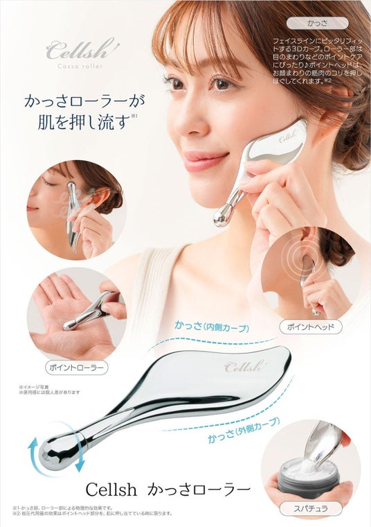 「Cellsh かっさローラー」は、フェイスラインにピッタリフィットする3Dカーブ。ローラー部は目のまわりなどのポイントケアにぴったり♪ポイントヘッドは、お顔まわりの筋肉のコリを押しほぐしてくれます。
