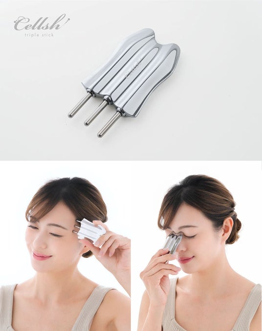 顔の筋肉は複雑で繊細な構造をしており、多くの部位が存在します。指圧代用器である「Cellsh トリプルスティック」は、この細かな筋肉にしっかりとアプローチし、グイっと押し込むことで、細部の筋肉のコリをほぐし、ピンポイントで血行を良くします。
