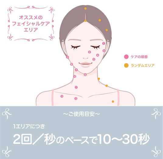 フェイシャルケアは、上図を参考に1.~13.までを順番に、左右均等にケアしていきましょう。ランダムエリアは、順番に関係なく気になる場所をケアしてください。頭皮は、生え際から頭皮全体を満遍なくケアするのがオススメです!