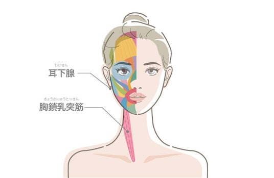 フェイスラインからはじめて、「耳下腺」を刺激し、首の「胸鎖乳突筋」と順番にケアしていきましょう。
