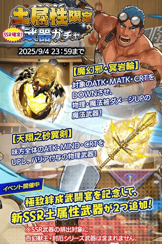 また、極致絆成武闘宴を記念して『土属性限定武器ガチャ』が登場!新たに『天翔之砂翼剣』、『魔幻邪・冥岩輪』の2つの武器が追加されます。