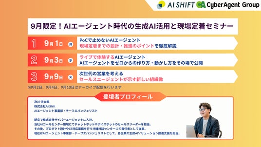 株式会社サイバーエージェント(本社:東京都渋谷区、代表取締役:藤田晋、東証プライム市場:証券コード4751)の子会社で、AIエージェント・生成AIリスキリング支援を提供する株式会社AI Shift(本社:東京都渋谷区、代表取締役社長:米山結人)は、企業における生成AI活用の定着と推進をテーマに、全3回のオンラインセミナーを開催いたします。