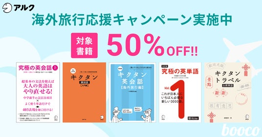 株式会社アルク(本社:東京都品川区北品川6-7-29 ガーデンシティ品川御殿山、代表取締役社長:田中 伸明)は、同社が提供する英語、韓国語などの語学学習アプリ「booco(ブーコ)」において、2025年8月13日(水)から9月18日(木)14:00 までの期間限定で「海外旅行応援キャンペーン」を実施します。本キャンペーンでは、海外旅行に役立つ英語・韓国語・台湾華語の人気書籍5点を、通常価格の50%OFFで提供します。