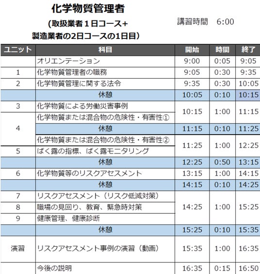 令和6年4月以降に化学物質管理者として選任される予定の方を対象に、必要な知識と実務能力を習得していただくため、学科9時間のカリキュラムによる講習です。