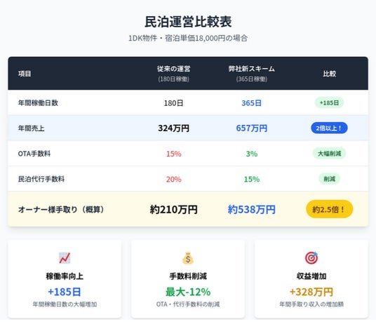 株式会社エアグローバルエージェンシーは、住宅宿泊事業法(民泊新法)における年間180日の営業日数制限を合法的にクリアし、年間365日の民泊運営を可能にする新スキームの提供を開始したことをお知らせします。