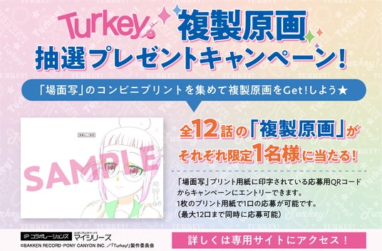 この『Turkey!』コンビニプリントでは、放送終了後の翌週(次話放送の前日)に各話より厳選された12点の「場面写」をL判写真用紙でプリントできる「場面写」、各キャラクターデザインの「シール」、「ポスター&ブロマイド」の3種類のプリントが楽しめます。