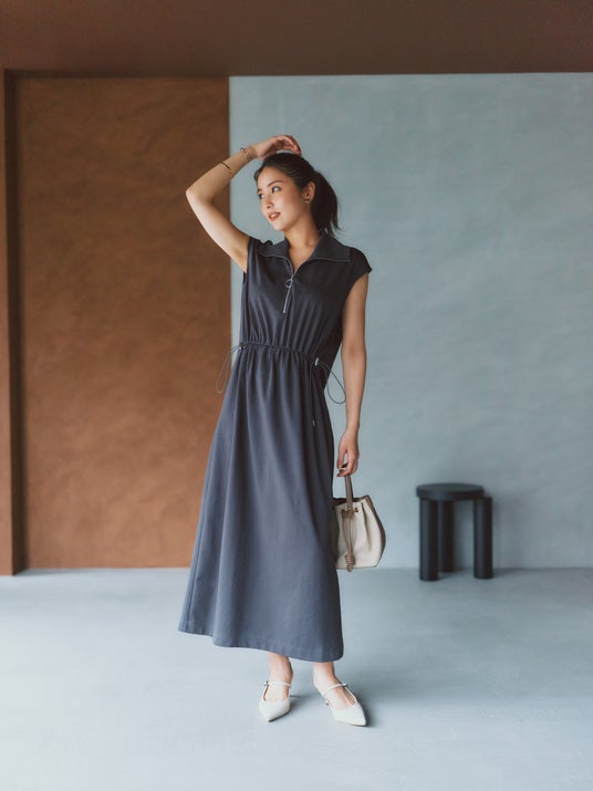 「ラクなのにサマになるワンピが好き。カットソー素材ってシンプルすぎると気を抜いてる感じがしますが、その点Stola.はさすが。ハーフジップやドロストデザインが効いていてお洒落!秋はシアーなトップスをインしても可愛いですよね。」