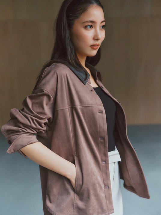 新しい季節の始まりに手に入れたい、軽やかに纏えるシャツブルゾン。スエードタッチのシャツ×レザー衿の異素材コンビが、秋らしさと洒落感を叶えてくれる。