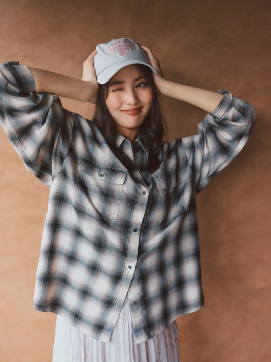 「秋の定番チェックシャツは、真夏コーデにさらりと合わせるだけでグッと秋めきますよね。ブラウンベースの優しいチェックもツボ。淡いピンクのスカートとキャップのピンクロゴをリンクさせた着こなしはデートにも!」