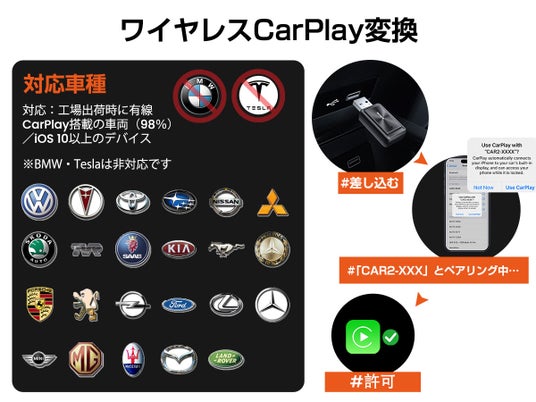 💡純正ケーブルでiPhoneを挿してCarPlay画面が表示される車なら使用可能です。