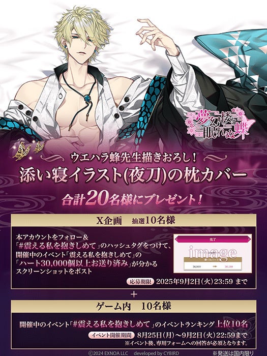 公式Xにて、ハッシュタグ「#震える私を抱きしめて」をつけて、ゲーム内イベントで「ハートを30,000個以上贈っている」ことが分かるスクリーンショットポストをされた方の中から、抽選で10名様に「添い寝イラスト(夜刀)の枕カバー」をプレゼントいたします。