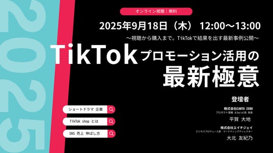 株式会社CARTA HOLDINGSのグループ会社で、デジタルマーケティングを中心とした事業を展開する株式会社CARTA ZERO(本社:東京都港区、代表取締役CEO:宇佐美 進典、以下「CARTA ZERO」)は、2025年9月18日(木)12:00より、ティーンに向けた多彩な事業を展開する株式会社エイチジェイ(東京都渋谷区、代表取締役:池田 隼人、以下「エイチジェイ」)と共同で、無料オンラインセミナー「TikTokプロモーション活用の最新極意」を開催いたします。