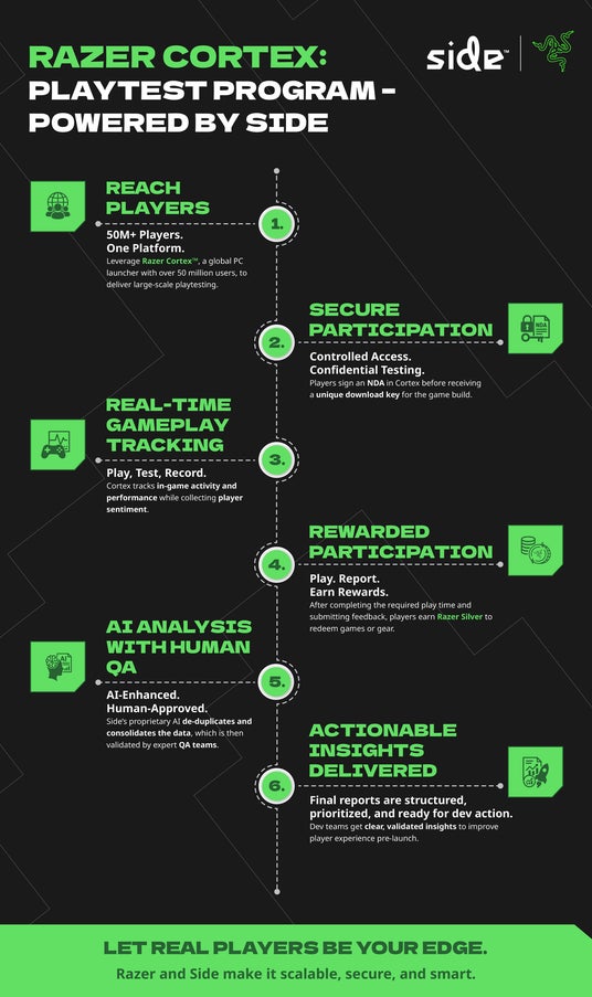 「Razer Cortex: Playtest Program - Powered by Side」は、従来のプレイテスト機能とQAを大規模に組み合わせたもので、開発者が定性・技術の両面でフィードバックを得られる初のオールインワンテストソリューションとなっています。この新しいツールは、世界中で5,500万人以上のユーザーを抱えるRazerのPCゲームランチャー、Razer Cortex内で起動するものです。実際のプレイヤーを対象にした大規模かつターゲットを絞ったプレイテストが実行可能になります。