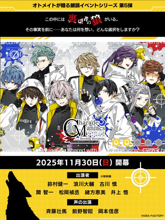 アイディアファクトリー株式会社(代表取締役社長:佐藤 嘉晃/所在地:東京都豊島区)の女性向けゲームブランド「オトメイト」は、2025年11月30日(日)にサンシティ越谷市民ホール 大ホールにて開催する、オトメイトドラマティックシアターvol.05「CharadeManiacs -Howling Deception-」のアニメイト先行抽選の申込みを本日より開始いたしました。