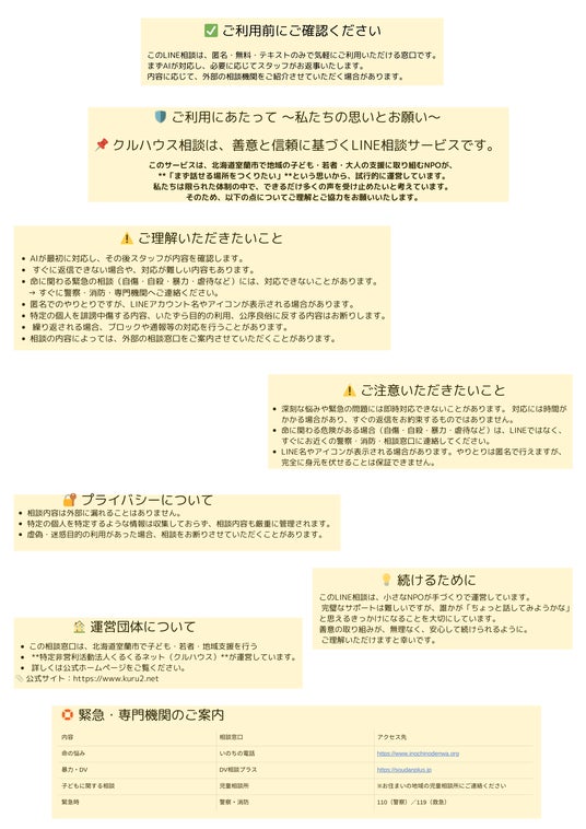 特定非営利活動法人くるくるネット(北海道室蘭市、代表理事:鳥山晃)は、孤独や不安を抱える子どもや大人を対象としたオンライン相談窓口「クルハウス相談」をLINEで提供しています。