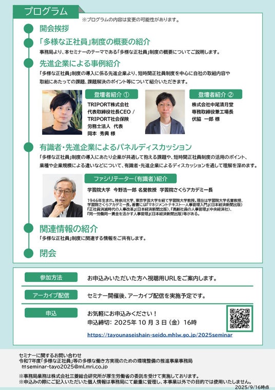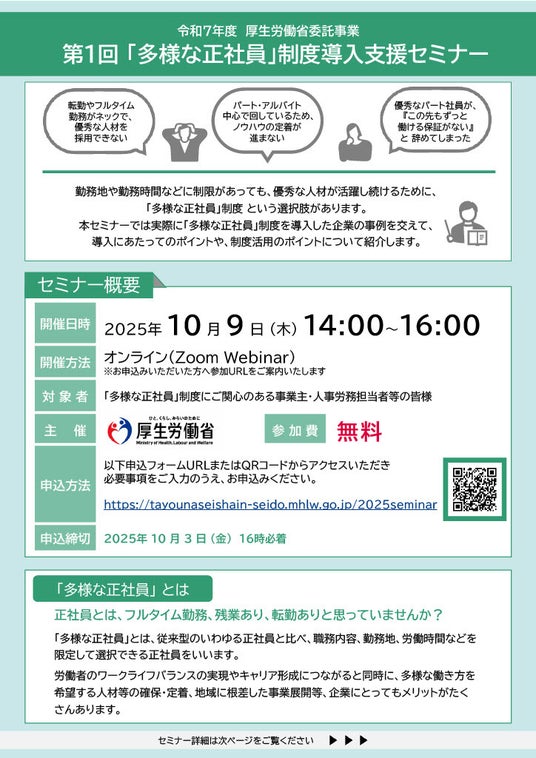 - 対象者 :「多様な正社員」制度にご関心のある事業主・人事労務担当者の皆さまなど- 参加費 :無料