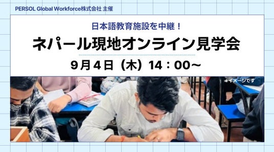 パーソルグループで外国人材に特化した人材サービスを提供するPERSOL Global Workforce(パーソル グローバルワークフォース)株式会社(本社:東京都港区、代表取締役社長:多田 盛弘)は、2025年9月4日(木)に、ネパールの現地日本語教育施設をオンラインで繋ぐ、オンライン見学会を開催します。「外国人材採用に興味はあるが、どんな人材かわからなくて不安」、「追加の外国人材採用を検討している」、「ネパール人材が気になる」という方々は、ぜひご参加ください。
