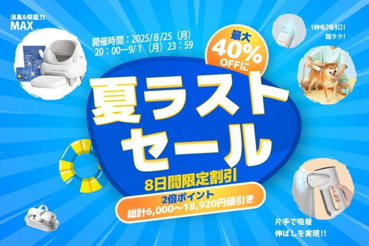 今回のセールでは、自動猫トイレ・衣類スチーマー・防臭ゴミ箱グルーミング掃除機などの人気製品が 最大40%OFF(最大18,920円引き) でご購入いただけます。