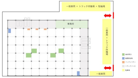 本センターは効率的な入出庫作業を実現するため、多くのトラックが接車できるよう、1階の二面にトラックバースを設置しています。