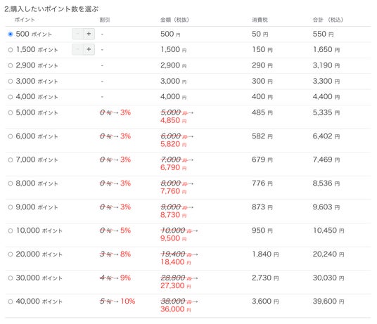 通常は20,000ポイント(22,000円税込)から割引ありの購入となりますが、上記期間(日本時間基準)でお支払い方法が銀行振込の場合のみ、5,000ポイントの購入から特別割引を適用いたします。