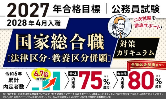 株式会社アガルート(本社:東京都新宿区、代表取締役:岩崎 北斗、以下「アガルート」)が運営する「アガルートアカデミー」は、公務員試験【2027年合格目標】国家総合職[法律区分・教養区分併願]対策カリキュラム(大卒)をリリースいたしました。