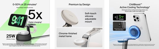 ピタッと吸着できるマグネットと安定して最大25Wのパワフル充電を提供するほか、独自のChillBoost Active冷却技術は、シリーズ唯一のOn/Offマニュアルファンシステムも搭載され、充電中の温度を更に7度低温化します。iPhone 16 Proの0-50%充電において、一般的なQi2 25W製品が29分間を要するのに対し、本製品はわずか25分で完了。4分間(約14%)の大幅短縮を実現します。