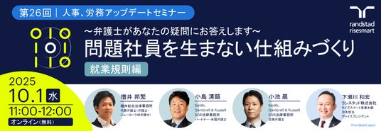 総合人材サービスを提供するランスタッド株式会社(本社:東京都千代田区 代表取締役会長兼CEO 道上 淳之介、代表取締役社長 猿谷哲)は、2025年10月1日(水)11:00~12:00に問題社員を生まない組織づくりにおける「就業規則」の重要性について学ぶオンラインセミナーを開催いたします。日米の労働法に精通した弁護士の先生方をお迎えし、実例等を踏まえて解説する人気のシリーズ「人事、労務アップデートセミナー」の一環として、今回は「問題社員を生まない仕組みづくり:就業規則編」と題し、組織の根幹を支える就業規則の役割と運用について深く掘り下げ、日本と米国での法的な考え方や対処法の違いを比較しながら解説いたします。