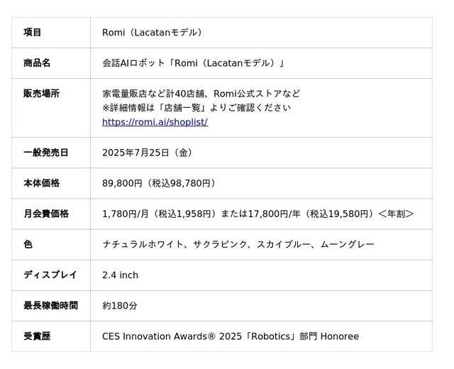 「CES 2025」において「Robotics」のカテゴリーに応募し、各カテゴリーで上位のスコアを獲得した製品に授与される「Honoree」に選出された「Romi(Lacatanモデル)」が、ヨーロッパの展示会で実機展示されるのは今回が初めてとなります。来場者の皆さまには、会話に連動して表情やしぐさが変化する、まるで生き物のような「Romi」の豊かな表現力や、「Romi」が見たものを理解し、その場で生まれる言葉だけに頼らない深いコミュニケーション体験など、“人に寄り添うAI”の最前線をご体感いただけます。