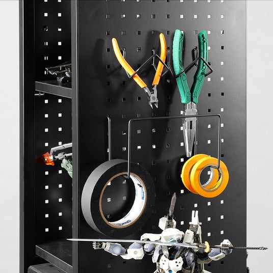 ラックの両サイドには、市販のフックやオプションパーツを取り付けられるサイドフレームを搭載。ペンチやニッパーといった工具を吊るして、すぐに手が届く場所にスタンバイさせておくことができます。小さなパーツや細かな工具を探す手間が省け、制作に集中できる環境を整えます。