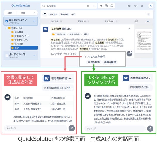 住友電工情報システム株式会社は、エンタープライズサーチ「QuickSolution(R)(クイックソリューション) Ver.13.5」を2025年8月29日より販売開始します。本バージョンでは生成AI連携(RAG*1)機能*2を強化し、検索結果に対する対話に加えて、その中から単一の文書を指定しての対話も可能になりました。また、対話でよく使う指示(要約・翻訳など)は、定型指示として自由に設定可能で、対話画面を開かずクリックだけで実行できます。生成AI活用の幅が広がったことに加えて利便性も向上し、これまで以上に社内情報の活用を推進します。
