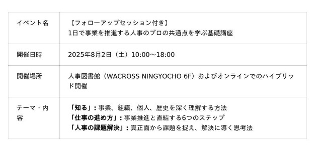 人事に関わる全ての人が集い、学び合うコミュニティ「人事図書館」では、こうした課題意識に応えるべく、事業を推進する人事のプロたちが実践している共通の思考法や行動を体系的に学ぶ講座を企画しました。