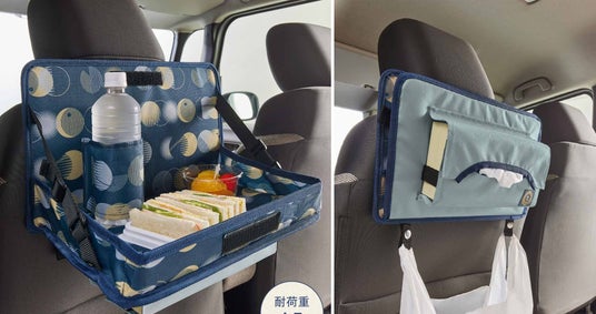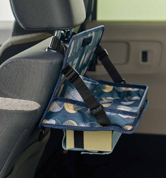 助手席のヘッドレストに取り付けられる折りたたみ式のテーブルラック。たたんである時はティッシュホルダーに、パカッと開くと軽食が置ける簡易テーブルに変身します。500~650mlのペットボトルが入るポケット付き。また、ごみ袋など軽量のものを引っ掛けられるスナップボタンが2つ付いています。