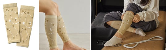 着圧サポーター:デザインは「幸運」を意味する水瓶座と「健康」のシンボルであるへびつかい座がモチーフ。靴下と合わせてはきやすい、ひざ下から足首までの使いやすい長さです。