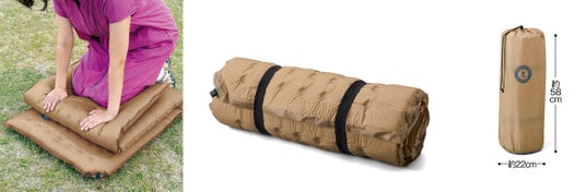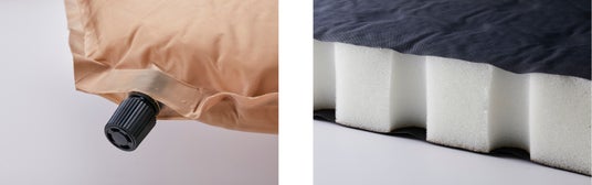 バルブを開き広げておくだけで数分後には膨らみます。 厚さ約7.5cm。 凸凹を感じにくく、規則的に空いた円柱形のエアーホールが体圧を分散。