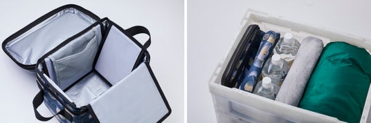 ふだんの買い物やアウトドアにも活躍するクーラーボックス。ソフトな素材で折りたたんで収納することが可能です。中の補強板を立てればボックスになり、凍らせたペットボトルを入れておけば保冷材の代わりにもなり、溶けた後は飲料水としても利用できます。天面には軽量のペットボトルなどを置けるちょっとしたテーブル付き。