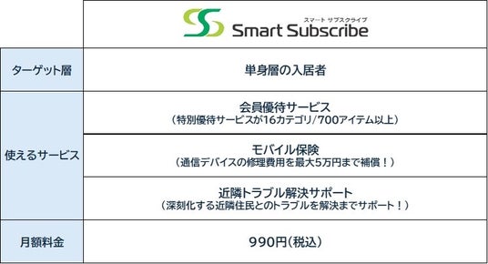 「Smart Subscribe」は、生活に関する各種サービスを“特別優待価格”でご利用いただけるほか、スマートフォン・タブレット・デスクトップPC・ノートPC・モバイルルーター・ゲーム機の修理費用を会員様が自己負担された場合に、最大5万円の保険金をお受け取りいただける「通信デバイス修理費用保険」が自動付帯されたサービスです。